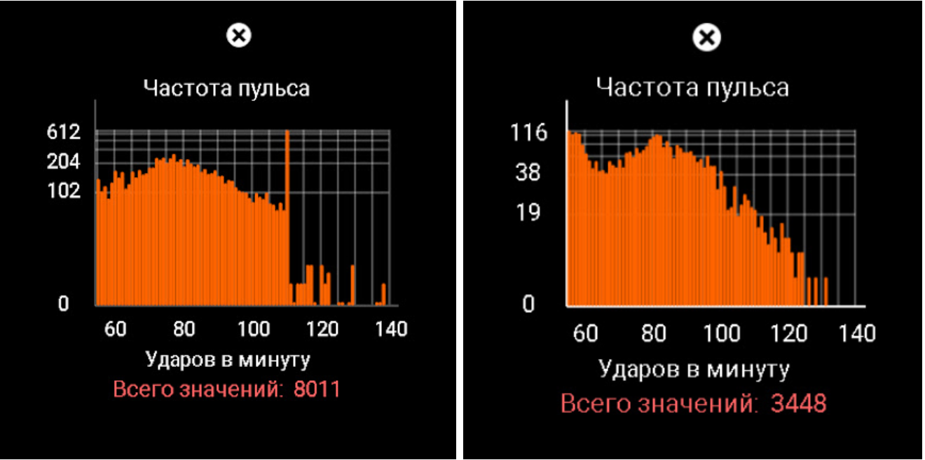 Also You can view the measurement quality of the heart rate sensor in your watch: Shows how often certain heart rate values are measured. The scale of the number of values is logarithmic, as it should be in such histograms: ![]() ![]() Here is an example of Mobvoi TicWatch Pro 3 (Fig. 1), Huawei Watch 2 (Fig. 2) and Samsung Galaxy Watch 4 44mm (Fig. 3) charts. You can see that Mobvoi TicWatch Pro 3 never gets some heart rate values, and the distribution itself is far from Gaussian. Also Mobvoi TicWatch Pro 3 has an erroneous value of 110, which is issued when the measurement fails. You can see how 110 sticks out of the chart. Huawei's and Galaxy's value graphs is much nobler and much closer to a Gaussian distribution. These are all graphs of the same heart of same person (mine). |